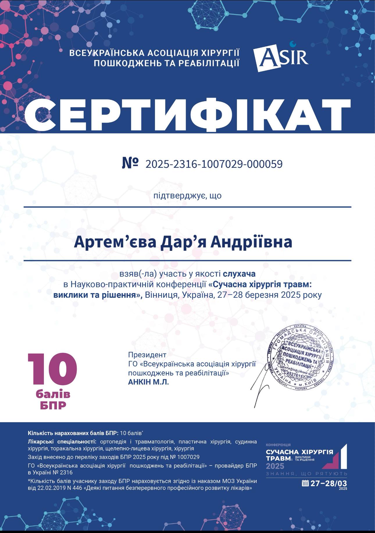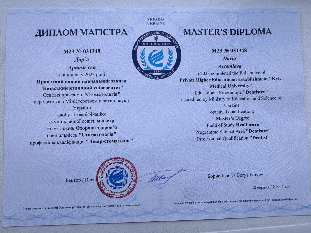 Закінчила Київський медичний університет, пройшла там інтернатуру. Спеціалізація «Хірургічна стоматологія» на базі НМУ ім. О. О. Богомольця.